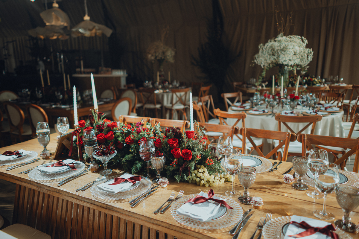 Las lámparas tipo pétalos, los tonos rojos intensos, los candelabros altos y la mesa exuberante crean una atmósfera artística, cálida y sofisticada, mezclando elementos clásicos con un aire moderno.
